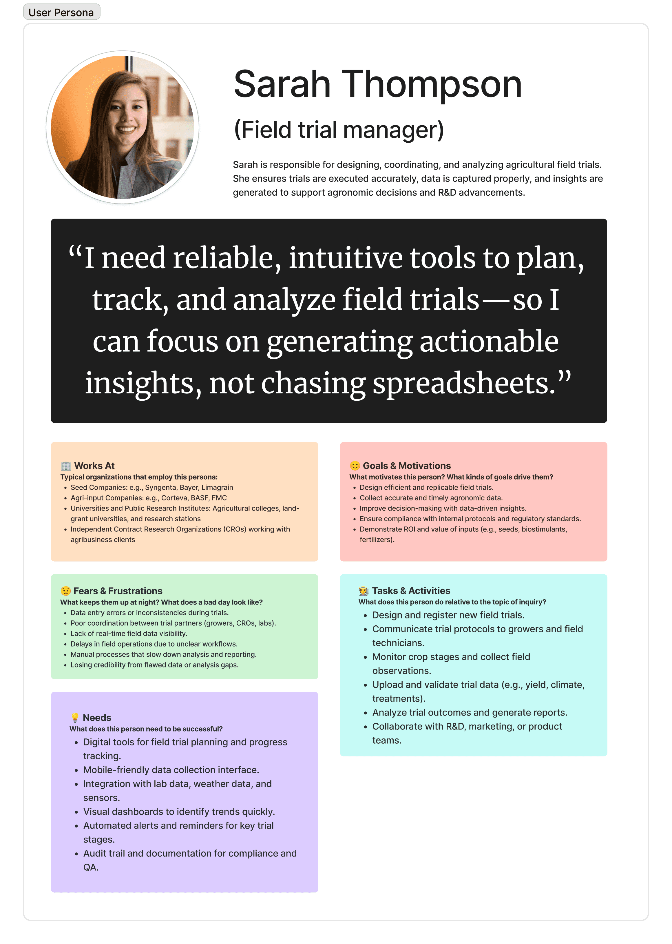 Field Trial Managers supervise trials, record data, and ensure results are usable. They’re mobile, time-pressured, and need simple, visual tools to speed up decision-making.
