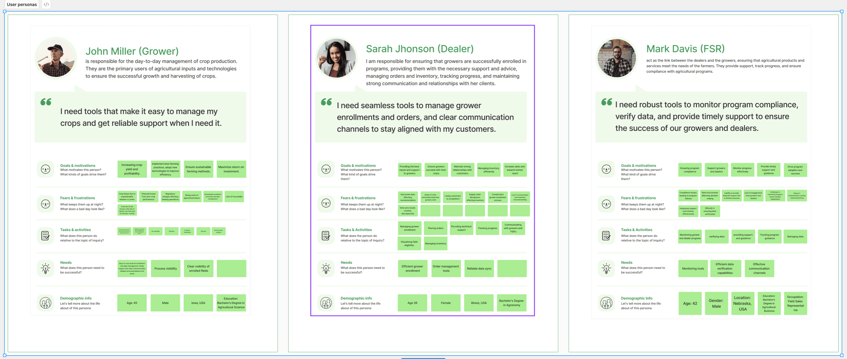 Built personas: John (Grower), Sarah (Dealer), Mark (FSR).
